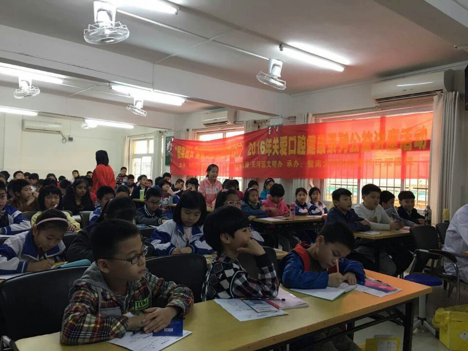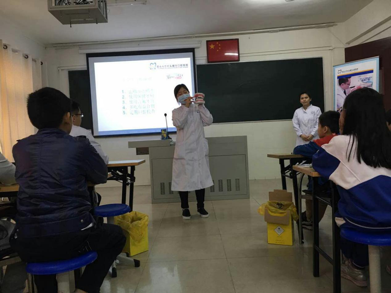 在讲座上,医生们通过新颖的讲座方式,充分地调动学生们的积极性,当穗华口腔医生提问问题时,学生们踊跃举手回答。