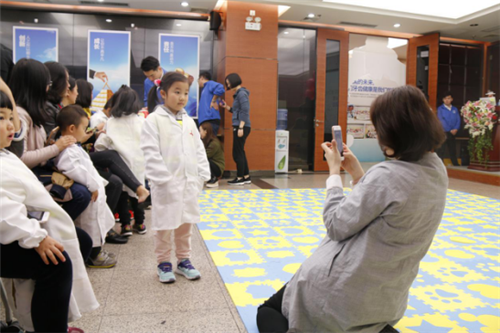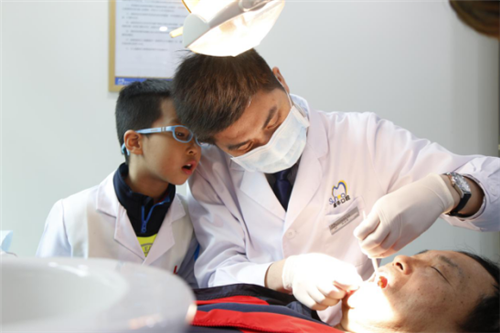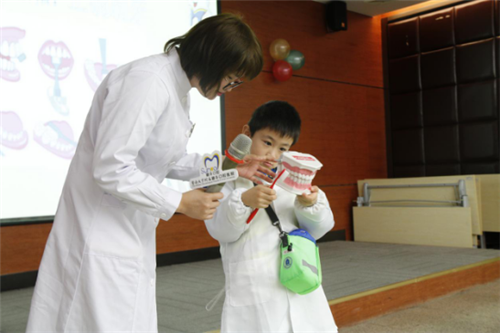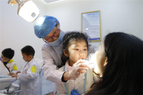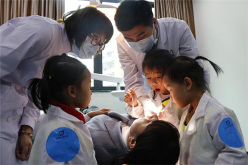 身穿洁白医生服的小牙医们像灵动的小天使,他们在医生的帮助下认认真真地为自己的爸爸妈妈检查口腔。