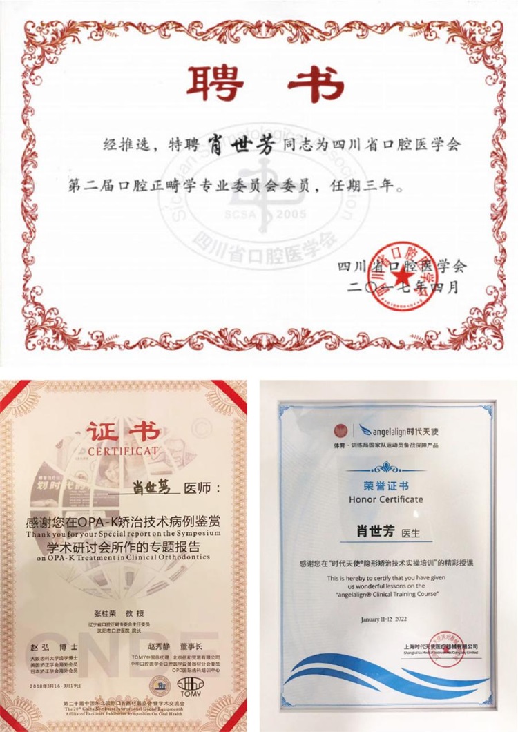 肖世芳院长,从事正畸临床工作20余年,曾在四川省公立三级口腔专科医院担任正畸科主任10余年,拥有丰富的正畸临床经验。是中华口腔医学会正畸专业委员会专科会员、暨南大学口腔医学院研究生实践指导教师,被聘任为四川省口腔医学会正畸专业委员会首任委员并在之后连任,成为中国大众文化学会口腔文化专业委员会第一届委员会常务委员。在正畸专刊上发表过多篇文章与专题报告。