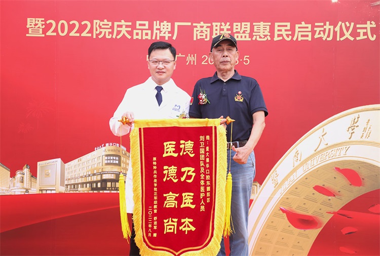 “(暨南大学)穗华口腔东圃院,盛大开诊启动欢,退休老兵来助战,可喜可贺笑开顔……”8月5日上午,在穗华口腔医院第九家分院东圃院区开诊之际,迎来了一位特殊的种植牙患者,他就是军事体育学教授舒进军长者。