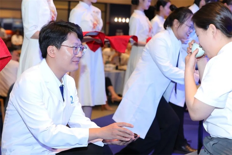 为树立青年医师敬畏之心与勤学之志,继承并弘扬尊师重道之义,穗华口腔医院集团国学文化老师曹辉先生现场指导出科医生向带教老师行三鞠躬礼,带教老师授予出科医生象征身份与职业、赋予责任与使命、承载理想与信念的白大褂。