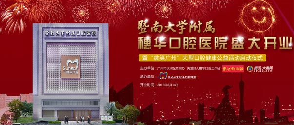 2015年6月14日,暨南大学附属医院穗华口腔盛大开业了,同时正式启动“微笑广州”大型口腔健康公益活动,为市民提供更优质、更便捷的口腔诊疗服务,并且成立“爱牙基金”,以博大胸怀,关爱缺牙老人、失独老人、鳏寡老人等社会各阶层市民的口腔健康。